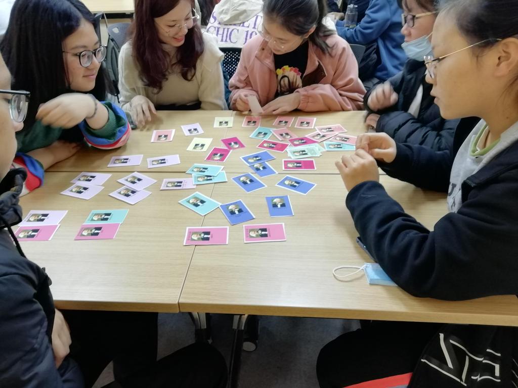 活动的第一部分为游戏环节。同学们按照分配好的小组围坐一桌,随后根据桌上50张卡片中的内容,拼凑连成与马克思有关的句子。游戏过程中,各小组同学团结合作,合理分工,9个小组间相互比拼,尽可能多的组成内容和逻辑均合格的短句。游戏完成后,按照各组组成合格句子的数量进行排名,排名靠前的两组获得奖品。