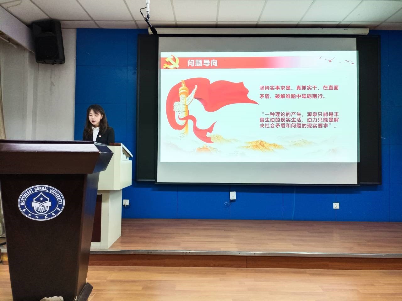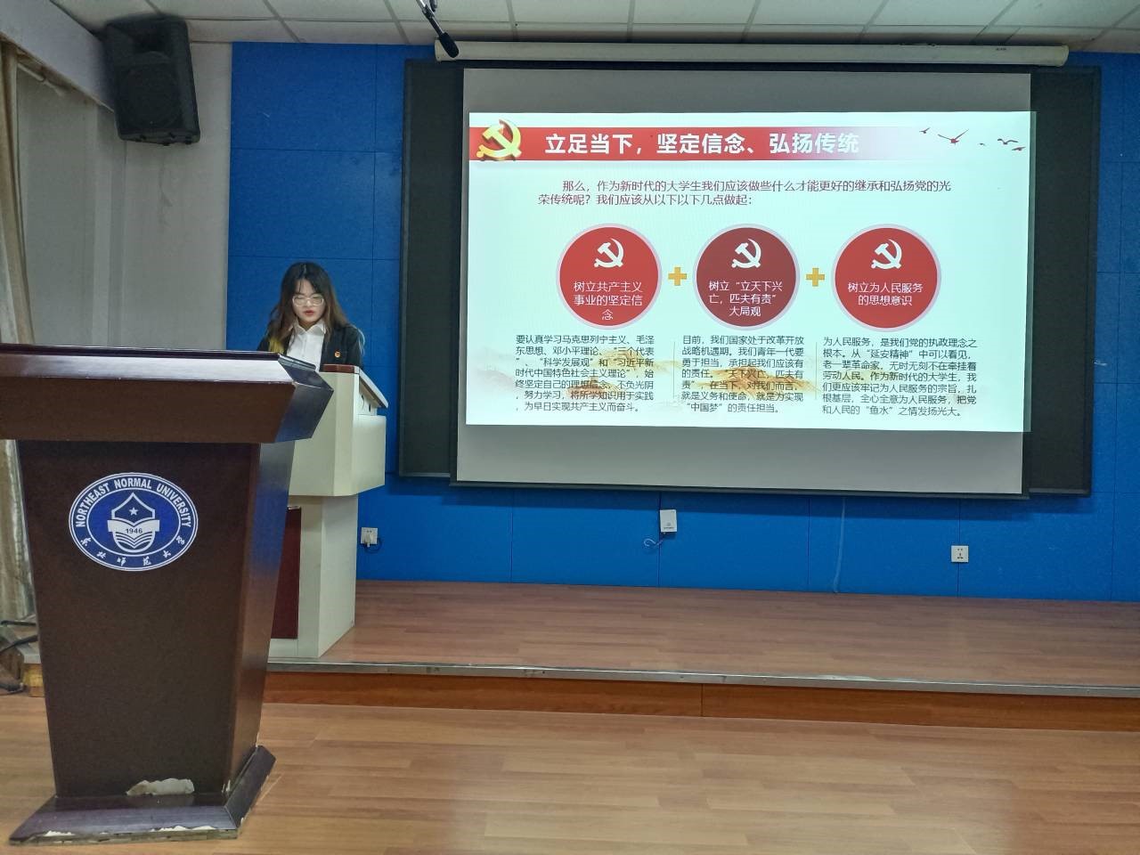汇报人孙旭冉着眼历史足迹,立足现在,回顾过去,展望未来,为同学们呈现了一幅美好愿景。一百年后的今天,我们所要做的就是传承我们党百年形成的光荣传统、优良作风、宝贵精神,自觉把思想和行动融入到实现党的历史使命和奋斗目标之中,不断增强投身民族伟大复兴的责任感使命感。