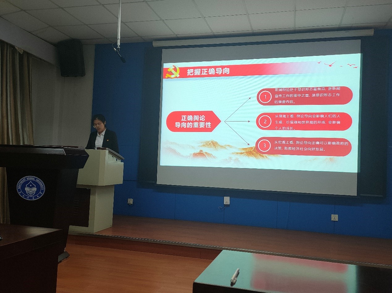 汇报人韩旭为我们讲述了在新兴媒体不断发展, 各种文化相互激荡, 舆论环境复杂多变的情况下, 如何坚持党性原则、坚持走群众路线、坚持科学引导以及其重要性。同学们应该明辨是非,坚决抵制歪曲和丑化党的历史的错误倾向,在大是大非面前做到立场坚定、旗帜鲜明,做到善于明辨是非、善于决断选择,始终保持鲜明的是非观念和共产党人的政治本色。
