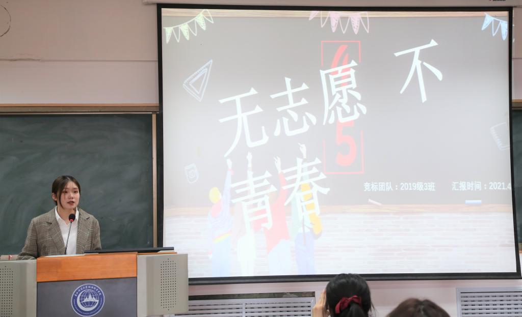 本次竞标以现场展示的方式进行,采用“3+2”的形式进行综合评定。其中“3”为3分钟竞标团支部的展示,可以通过PPT、演讲等方式向评委展示团支部对其招标项目的活动规划等,充分展示团支部的优势与特色。“2”为2分钟评委提问与点评,评委对参与团支部进行提问、点评并对各支部表现打分。活动开始,各班团支部负责人按既定顺序上台进行展示。展示结束后,王玉老师和董文标老师进行总结发言,对各支部在志愿服务项目中展示出的热情给予了肯定。本次竞标的最终结果将于近日在地理科学学院楼一楼公示牌和线上进行公示。