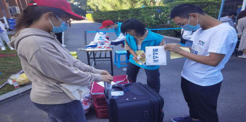 新生在学校门口进行核酸检测后,到学思路化学学院摆台处进行登记,辅导员和学长学姐会给新生发放校园卡以及学院为新生准备的校园地图、新生攻略、口罩等物品,并组织新生进行报到签名。学院也安排了行李运输车来帮助新生将行李运送至寝室。