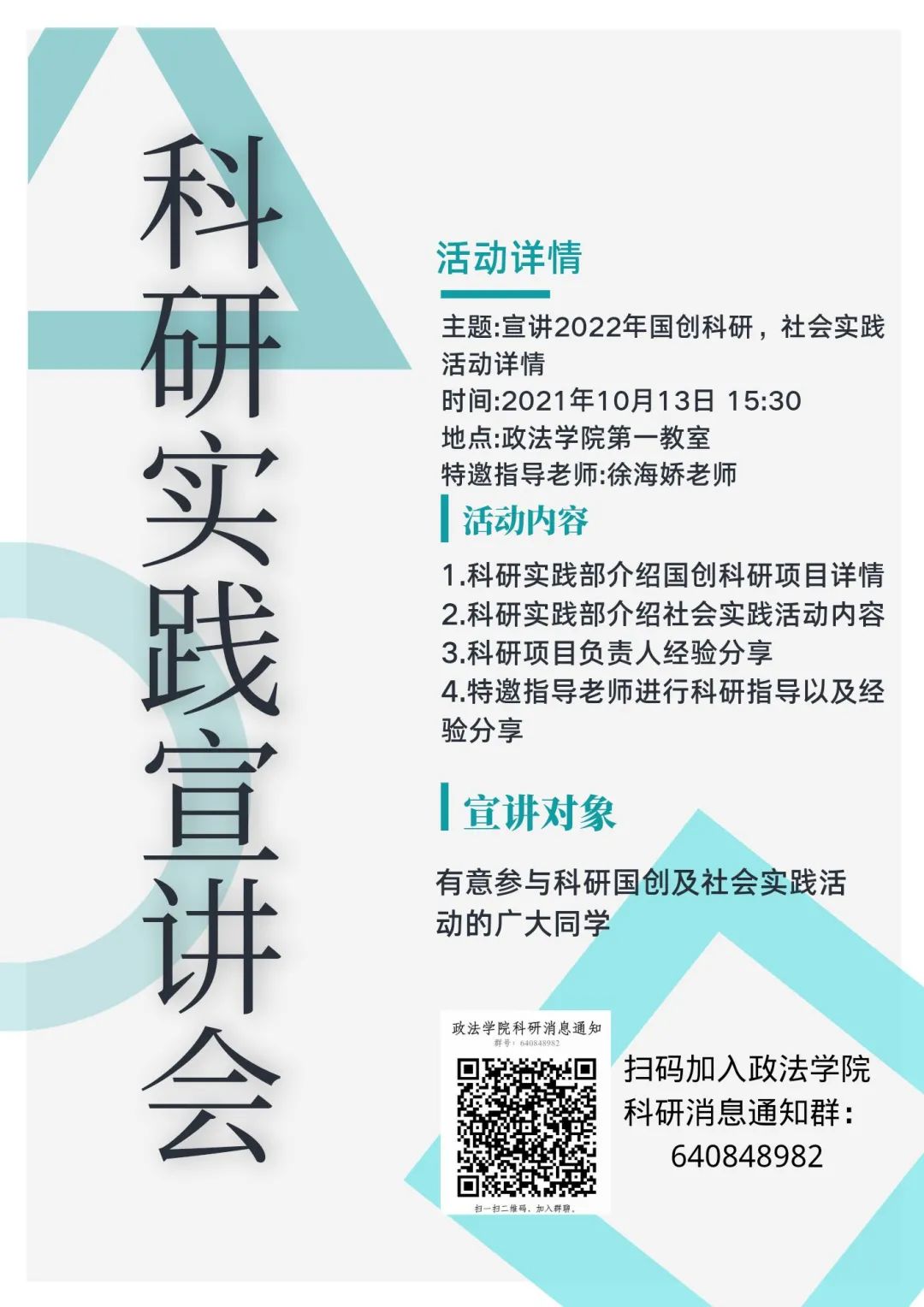 为了加强我院对科研实践成果的积极宣传,促进同学们对科研实践的了解,鼓励同学们积极参加科研国创与寒暑期社会实践活动,助力成长成才,由政法学院团委科研实践部承办的科研实践宣讲会将于本周三在政一教室开展。