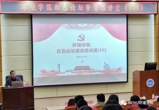 2021年4月14日,由东北师范大学环境学院青马学会主办的红色论坛暨青思讲堂第三期在环境学院203报告厅顺利举办。这次活动邀请到中国现代史学会副会长、东北师范大学马克思主义学部程舒伟教授担任主讲人,带领大家一同回顾了中国共产党的百年党史。本次活动既是对党员、入党积极分子的培训活动,也是对学院青年马克思主义者的思想引领活动。参加本次活动的老师有环境学院党委副书记赵轩、团委书记王隽媛、2017级辅导员王一戎、2018级辅导员秦朗和2019级辅导员李康靖。