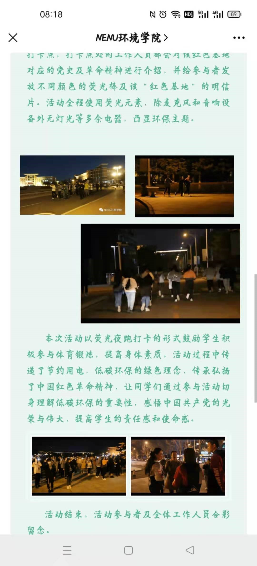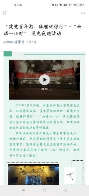 2021年3月27日晚,由东北师范大学校团委主办、环境学院承办、美术学院协办的“建党百年游,低碳环保行”-“地球一小时”荧光夜跑活动于东北师范大学净月校区圆满完成。本次活动被吉林卫视电视台宣传报道。