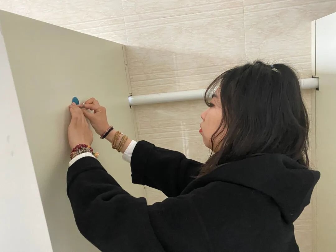 为响应政法学院学生会“我为同学办实事”活动的号召,同时为同学们秋冬季节如厕提供便利,10月17日上午,学生会文体部成员对政法学院卫生间隔间的粘钩进行了检查翻修。