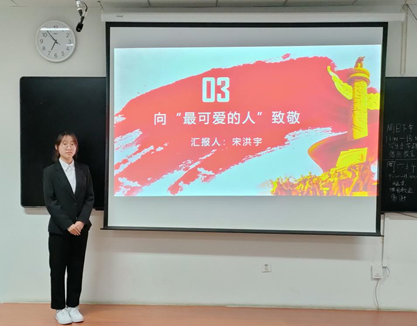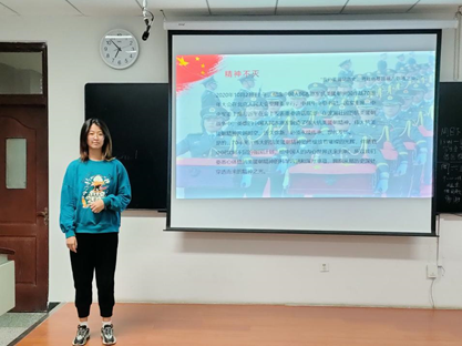 “保家卫国,英雄豪气壮河山”——汇报人王欢向我们介绍了抗美援朝胜利及意义。这场战争的胜利不仅打破了美国不可战胜的神话,让我国得到世界更大的尊重,更为亿万中国人留下了宝贵的精神食粮——抗美援朝精神。