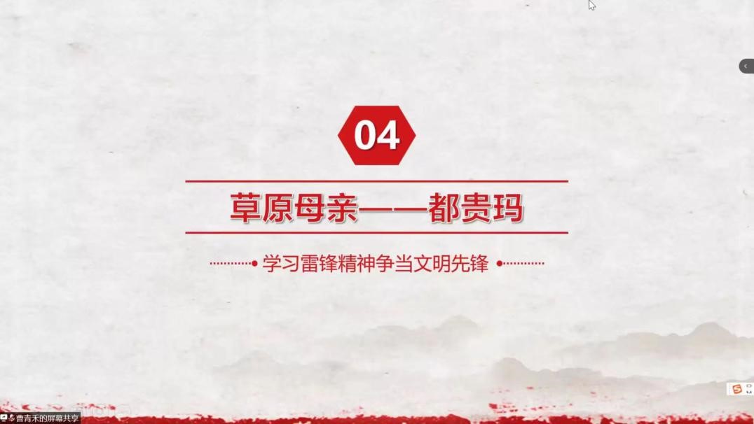 汇报人曹青禾介绍了草原母亲——都贵玛。她是人民楷模,是全国道德模范,生活艰苦的6、70年代,她挺起脊梁用温情托起28个孤儿的明天,顶住压力用毅力担起肩上的重任,那些用爱编织的平凡故事让同学们为之动容。