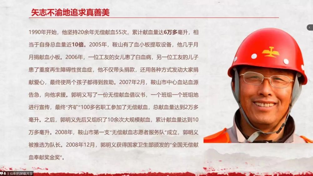 汇报人王佳昕分享的故事关于一位乐于奉献,追求纯粹的人民英雄——郭明义。声情并茂的讲述让同学们深刻意识到那一份以雷锋为榜样,以雷锋精神为指引,为祖国发展、社会进步贡献青春力量的新时代大学生义不容辞的责任。