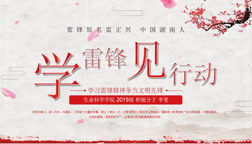 雷锋精神永不过时,因为它与中华民族的传统美德和伟大的民族精神始终相连。通过此次学习,相信作为新青年的同学们,定会秉持着雷锋精神,成个人之志,担时代之事。