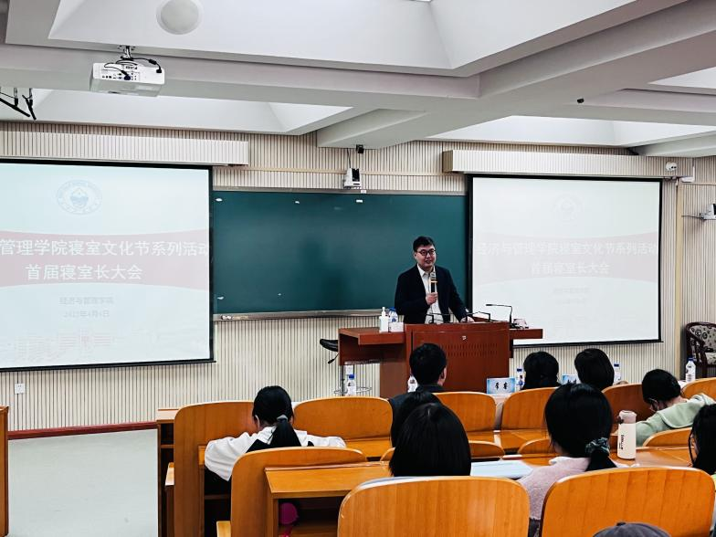 寝室作为学生学习、生活、休息的重要场所,是寝室成员的温馨港湾。为营造良好的寝室文化氛围,提高寝室生活质量,弘扬“团结友爱、互帮互助”的精神,共筑温馨、舒适、整洁、健康的寝室环境,经济与管理学院于2023年4月6日举办寝室文化节系列活动——首届寝室长大会。邀请东北师范大学学生宿舍综合管理办公室主任常睿老师以“寝室你我他”为题为寝室长们作报告。