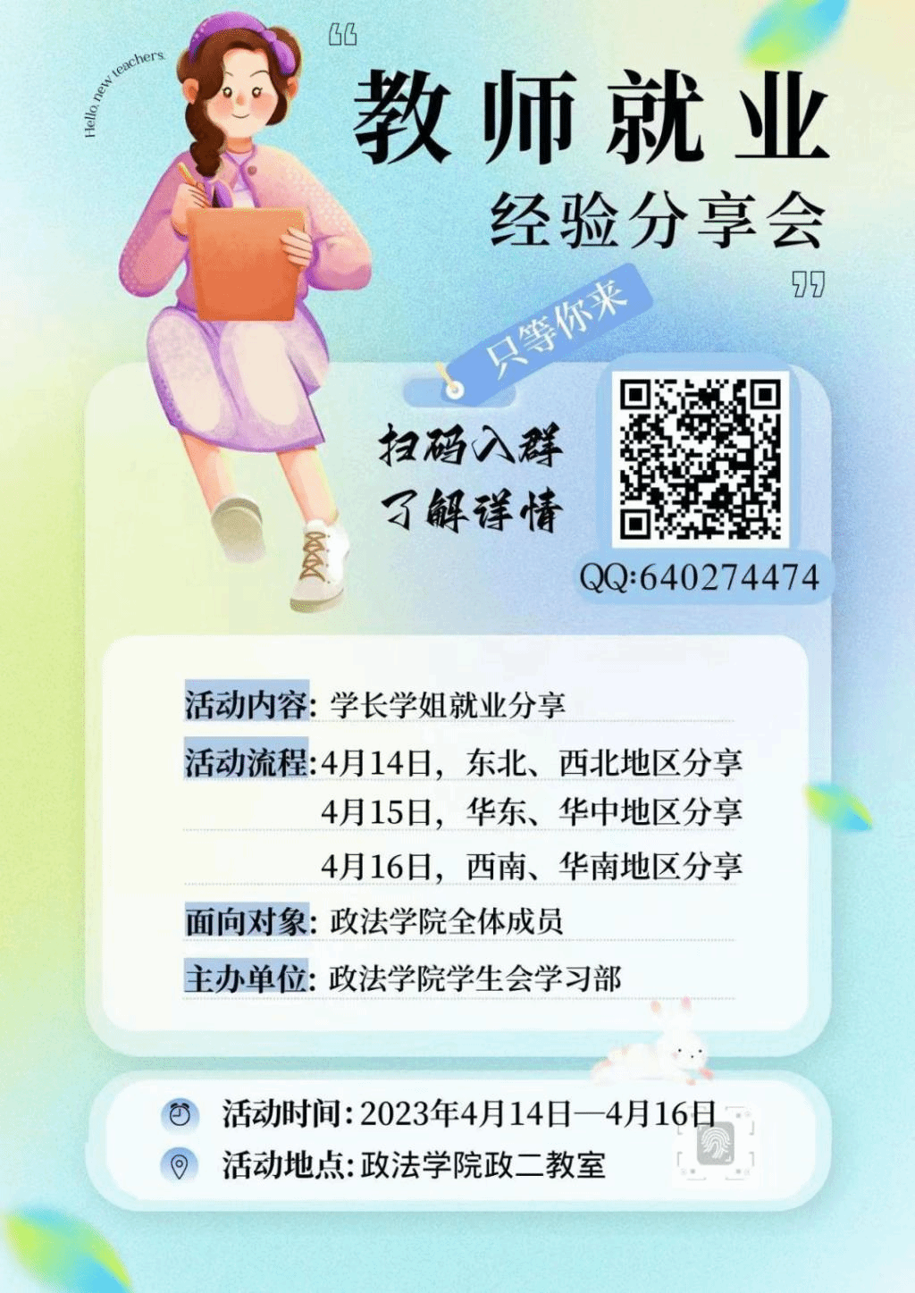 各位同学,你是否想提早为自己做好职业规划?如果答案肯定,那么恭喜你,学生会学习部为你排忧解难!我们向你发出诚挚邀请,欢迎参加教师就业经验分享会,在这里会有来自不同地域的大四优秀学长学姐进行他们的教师就业经验分享,引领你的职业航向,助你获得理想工作!