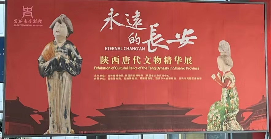 本次观展的地点是吉林省博物院一层“永远的长安—陕西唐代文物精华展”。展馆以“东方之都”、“乐居长安”、“丝路胡风”三部分展现,引领我们走进“九天阖闾开宫殿,万国衣冠拜冕旒”的大明宫,重回“长安大道连狭斜,青牛白马七香车”的长安城。