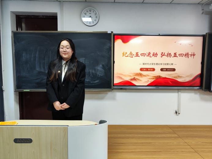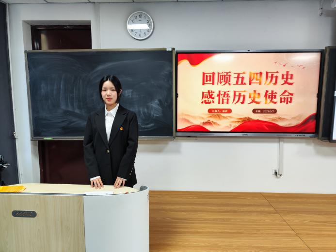 汇报人陈秒从五四运动的先声、导火线、爆发及其后续发展四个方面,带领同学们回顾五四运动的发展历史,阐明五四爱国运动促进中国人民新的觉醒,具有推动新思想的传播、影响中国共产党的诞生和发展的重大历史意义。
