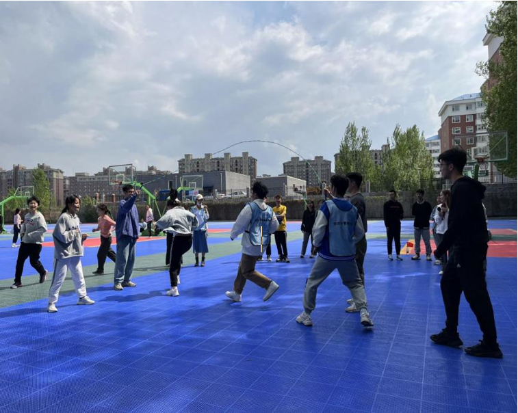 本次趣味运动会采取两个项目同时进行的方式开展,率先开赛的是跳大绳和车轮滚滚。其中,跳大绳的同学们一起喊着口号,数着节拍,配合得越来越默契。