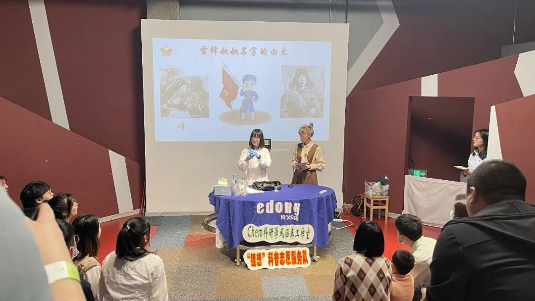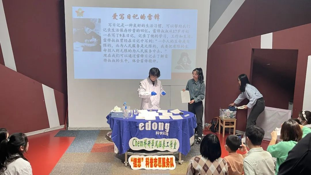 2023年3月5日,“锂想”科普志愿服务队在edong科学馆开展少儿科普活动,活动当天为“学雷锋纪念日”,因此本次活动用科学实验现象表现“雷锋精神”,为科学馆的小朋友带去精神鼓舞和实验体验。实验一为“大象牙膏”,喷涌而出的实验现象象征雷锋奋勇向前,勇攀高峰的精神;实验二为“火龙写字”,对应雷锋日记,鼓励在场小朋友像雷锋学习,养成写日记的好习惯;实验三为“人造雪”,模拟雷锋拨开积雪带领村民植树的场景;实验四为“变红的小花”,邀请在场小朋友动手参与,并将做好的变色小花送给在场的家长。志愿服务队也为参与的小朋友送去了东师礼物,整场活动在小朋友争先恐后的参与和欢声中结束,活动受到了场馆人员和参与家长的好评。