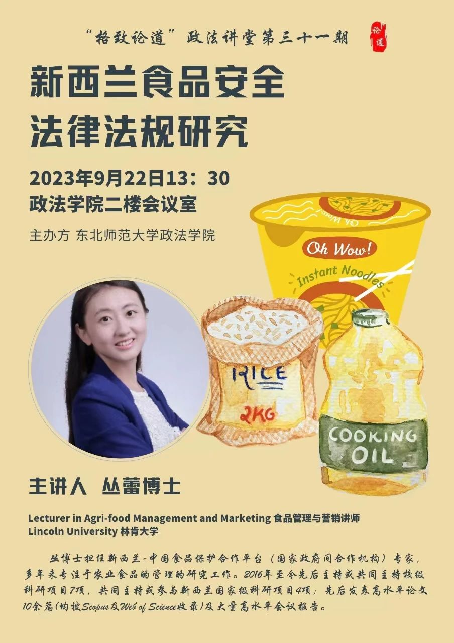 2023年9月22日,政法学院第三十一期“格致论道”讲堂在政法学院二楼会议室成功举行。本次学术报告邀请到了新西兰林肯大学农商学院食品管理与营销讲师丛蕾博士,她分享的主题为“新西兰食品安全法律法规研究”。本期讲座由政法学院尹奎杰教授主持,法学专业相关老师和同学们参加了此次活动。