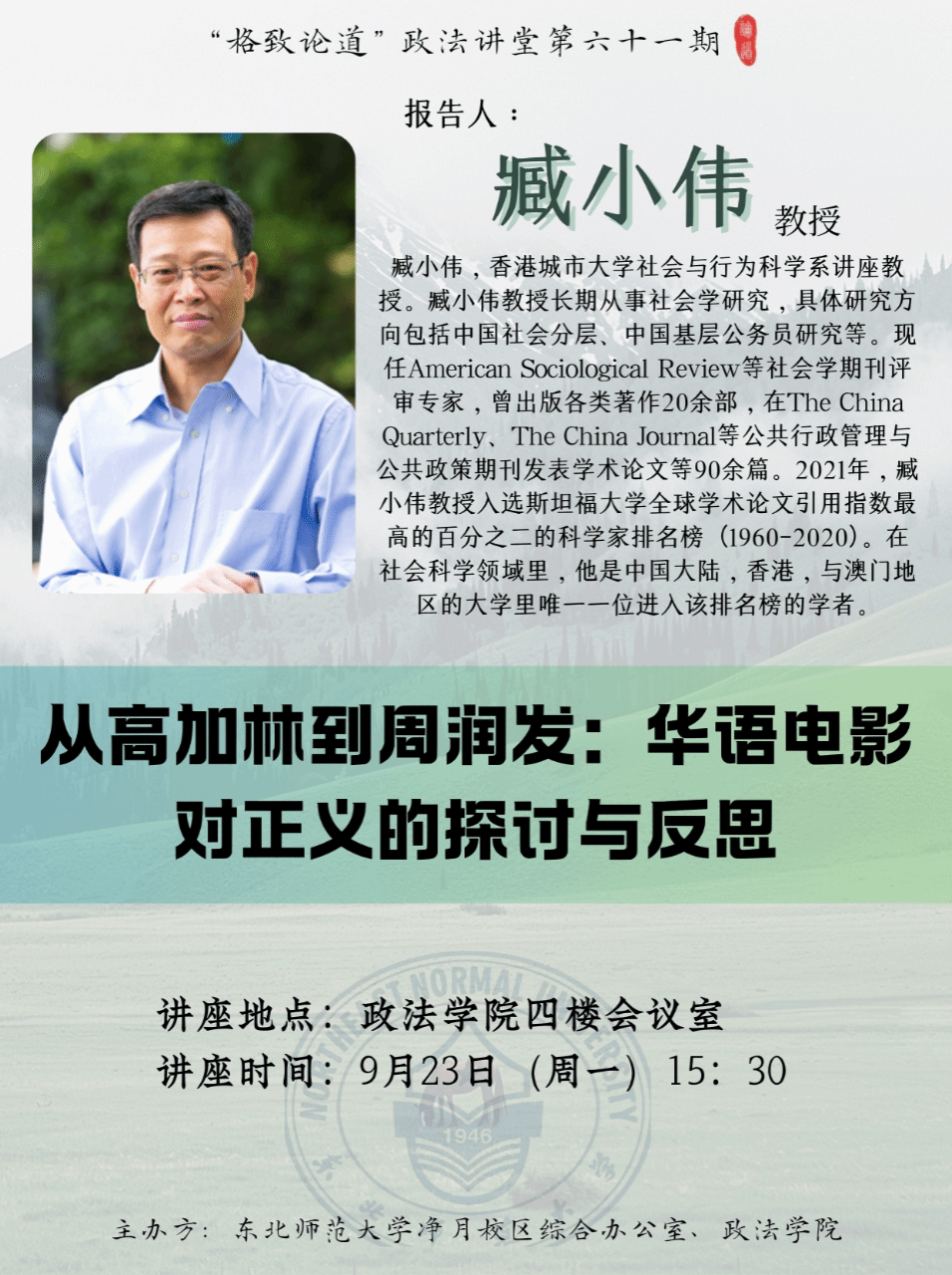 9月23日,我院“格致论道”政法讲堂第六十一期在政法学院多功能厅如期举行,本次讲堂特邀香港城市大学社会与行为科学系臧小伟教授,围绕华语电影中的正义与非正义问题为师生呈现了高水平的学术盛宴。近百名师生聆听了讲座。
