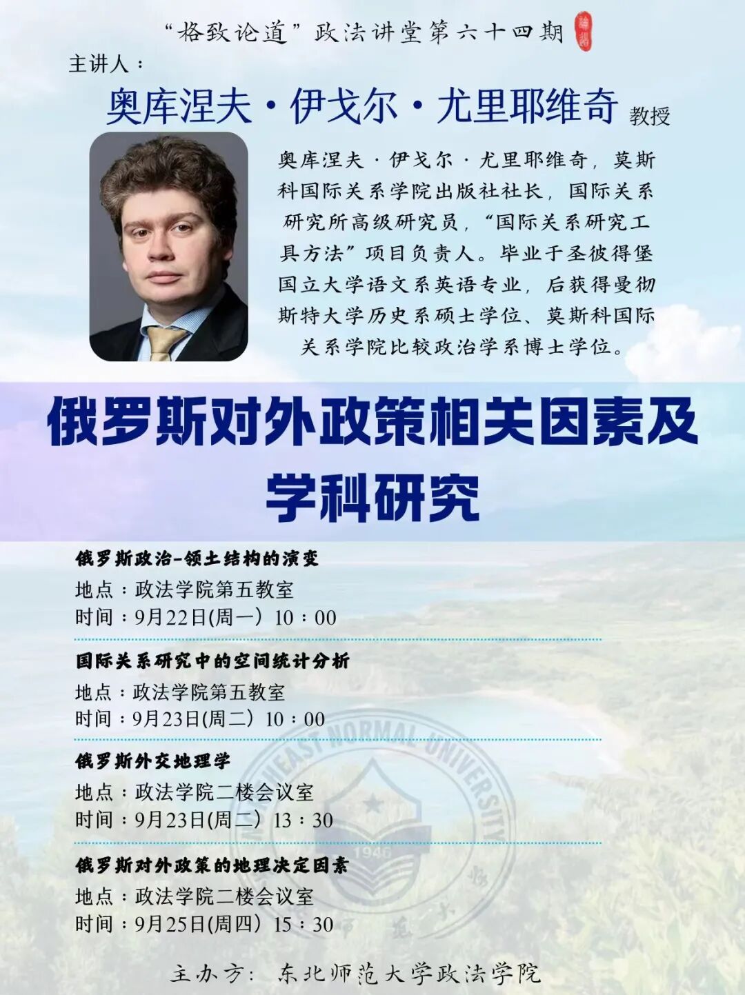 2025年9月22-25日,俄罗斯莫斯科国际关系学院出版社社长、国际关系研究所高级研究员奥库涅夫·伊戈尔·尤里耶维奇教授莅临“格致论道”东师政法讲堂。尤里耶维奇教授毕业于圣彼得堡国立大学语文系英语专业,后获得曼彻斯特大学历史系硕士学位、莫斯科国际关系学院比较政治学系博士学位,具有深厚的学术积淀和跨学科研究背景,是俄罗斯国际关系研究领域的杰出学者。