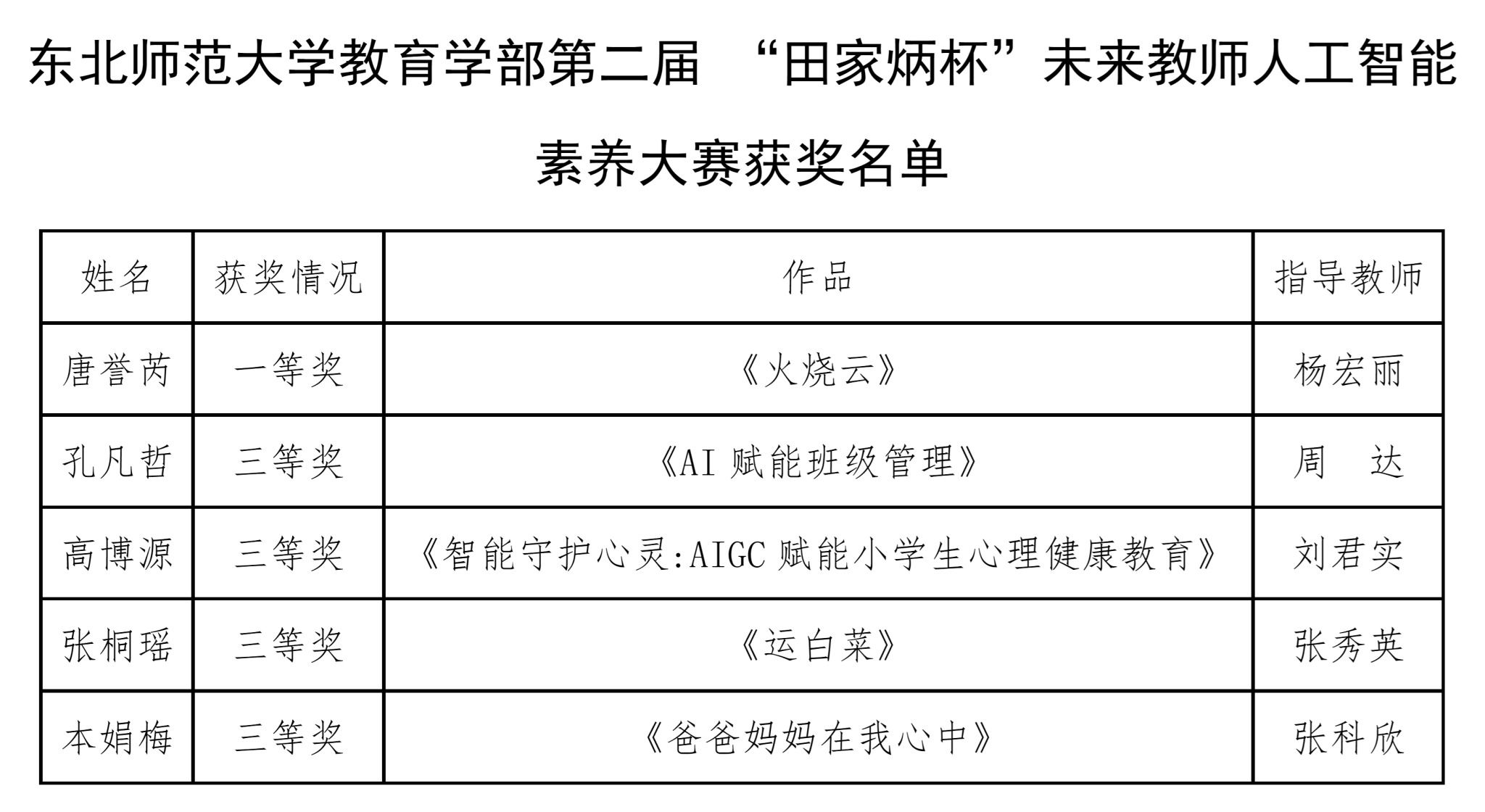 近日,由东北“三省一区”未来教师数字素养提升项目协作组主办的第二届“田家炳杯”未来教师人工智能素养大赛圆满落幕。作为东北“三省一区”聚焦未来教师数智化能力培养的核心赛事,本届大赛以“赋能未来教学,提升AI素养”为宗旨,吸引区域内多所师范院校的优秀师范生同台竞技。东北师范大学教育学部学子在本次赛事中表现突出,共斩获一等奖1项、三等奖4项,充分彰显了学部在师范生数智化教育培养领域的扎实成效与领先优势。