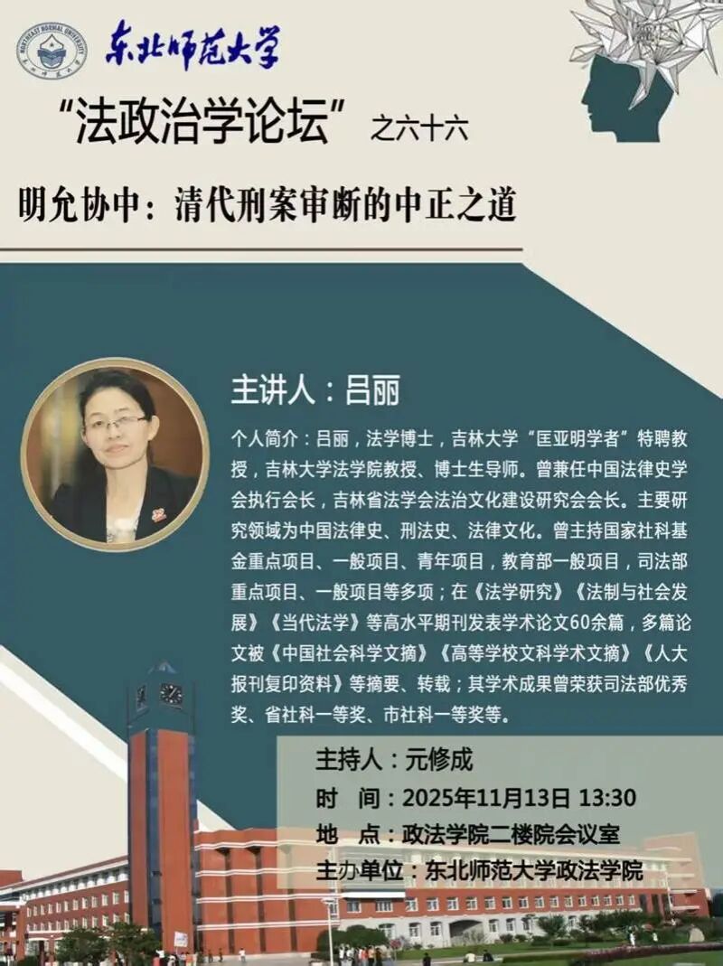 2025年11月13日,东北师范大学政法学院“法政治学论坛”第六十六期在学院二楼会院议室举行,本次论坛特邀吉林大学“匡亚明学者”特聘教授,吉林大学法学院博士生导师吕丽教授担任主讲人,主题是“明允协中:清代刑案审断的中正之道”。此次活动由学院党委书记元修成主持,我院副院长张姗姗及师生共50余人参与了本次论坛。