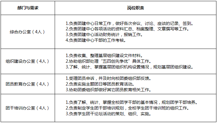 团建中心下设五个办公室,包括:综合办公室、组织建设办公室、团员教育办公室、团干培训办公室和信息宣传办公室。两校区各招募团建中心干事20名,具体要求如下: